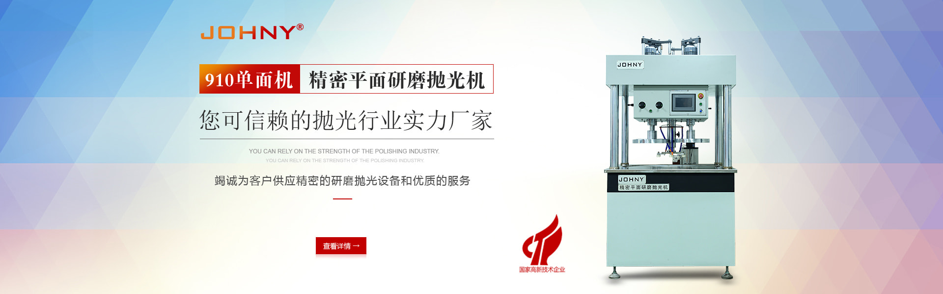 东莞市中研机械设备有限公司(以下简称“JOHNY”)成立于2012年,是一家专注于单面研磨抛光机、双面研磨抛光机、翻转机等机械研发和生产的公司。其研发产品主要用于手机玻璃、手机外壳、蓝宝石、陶瓷、不锈钢、金属、非金属等材料的超高精度研磨抛光。JOHNY为客户提供专业的高精度超高镜面研磨生产系统的整体解决方案,包括单面和双面研磨抛光机、各类研磨盘、研磨垫、研磨液以及配套的生产工艺。